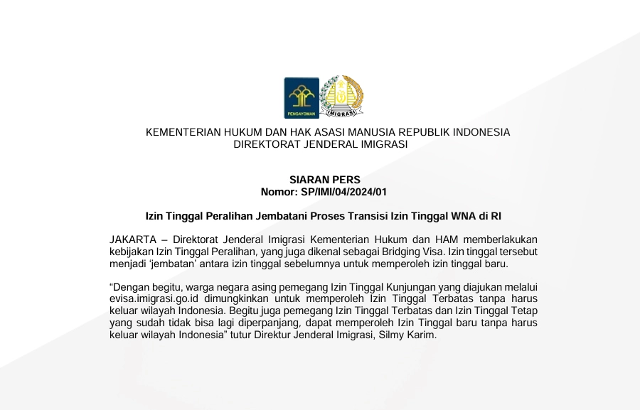 Foreigners who wish to use a Transitional Residence Permit must apply Apply via the evisa.imigration.go.id and pay the fee immigration no later than 3 (three) days before the validity period of the previous residence permit expires.  “The implementation of the Transitional Stay Permit is an effort by the Directorate General of Immigration creating legal certainty for foreign citizens residing in Indonesian territory as well as ease of service,” he concluded.